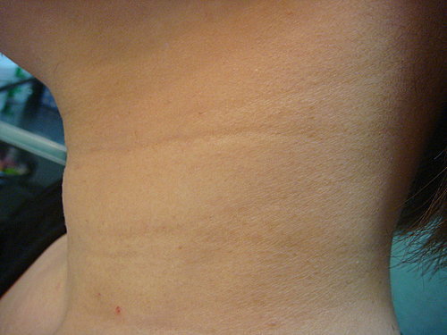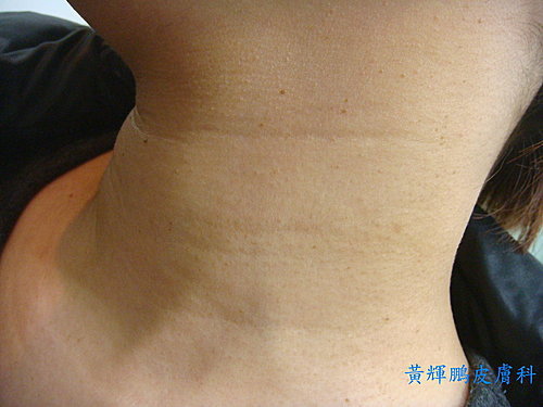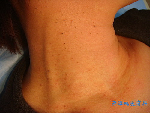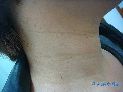 ※ 頸部多發性息肉通常與遺傳有很大的關係,而此患者也常伴隨如臉部、頸部甚至胸腹部針頭至米粒大小,平頂微凸之角化丘疹,後者屬於早期的脂漏性角化,正確名稱叫黑色丘疹膚病。