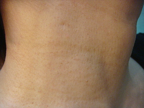 上圖:頸部多發性息肉患者常伴隨黑色丘疹皮膚病,臉部與腹部