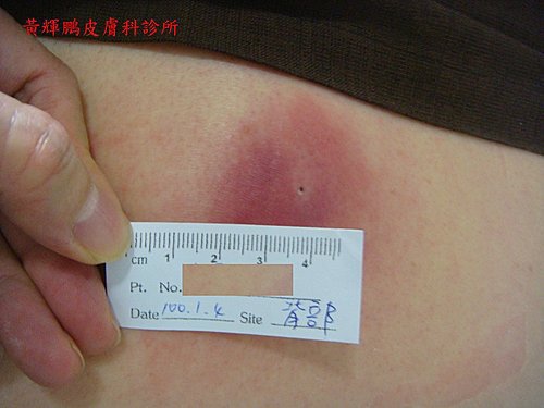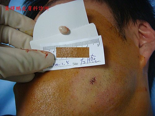 圖三、粉瘤發炎紅腫熱痛 圖四、開刀切除可見球形囊腫